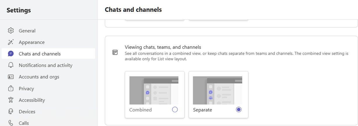 To change your view, go to Settings > Chats and channels > Viewing chats, teams, and channels: