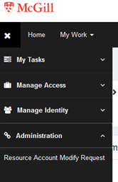 - Using the hamburger menu icon select Administration then Resource Account Modify Request